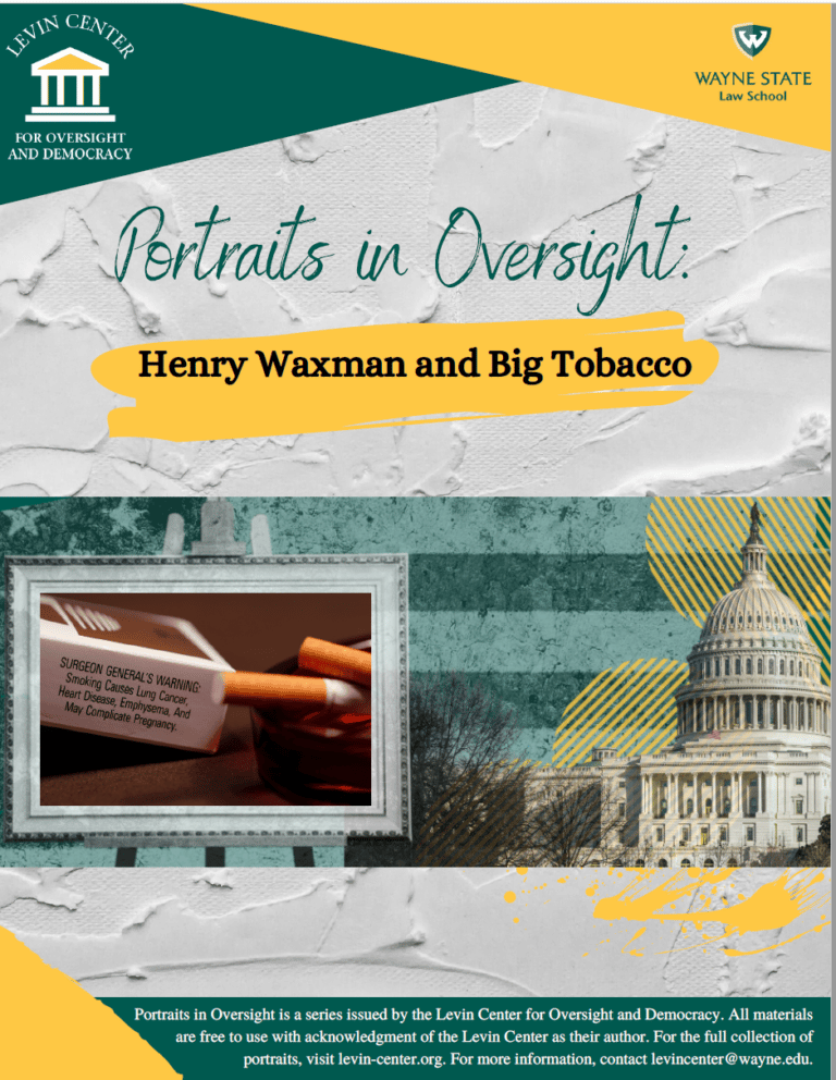 Today, the Levin Center for Oversight and Democracy is releasing a Portrait in Oversight describing the 25-year battle waged by Congressman Henry Waxman to expose the health hazards caused by tobacco products and establish safeguards to protect public health. His successful oversight effort, which enlisted both Republican and Democratic colleagues, models how Congress can protect American families from products that endanger their well-being.